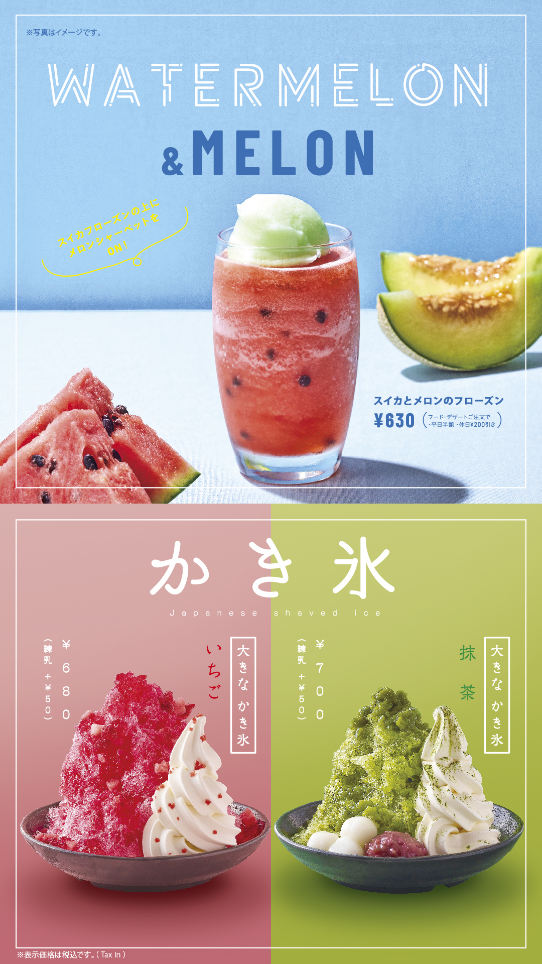 ※「スイカとメロンのフローズン」は、からふね屋珈琲三条本店、山科店、からふね屋CAFEあべのキューズモール店、ビエラ高槻店でのみ販売しています。(フードと一緒にご注文いただくとお得な割引を行っています)