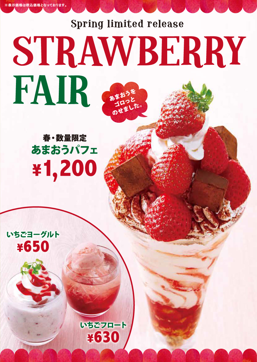 メニュー 2017年3月31日 3/6~5/31「ストロベリーフェア」 「ストロベリーフェア」販売開始 販売期間:2017年3月6日(月)~5月31日(水) ・あまおうパフェ ・いちごヨーグルト ・いちごフロート ※店舗により価格が異なります。
