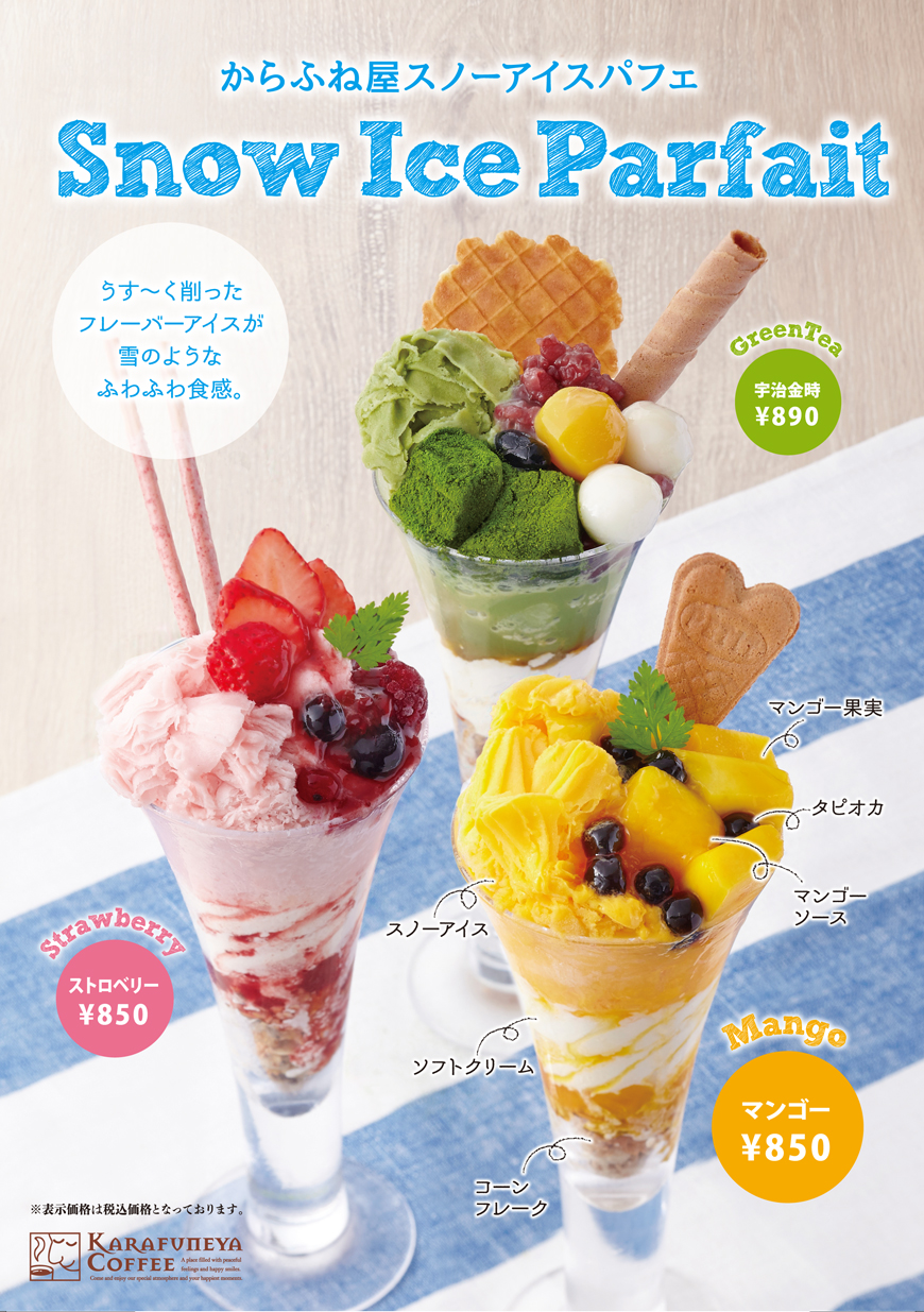メニュー 2017年8月1日 8/1~9/30「からふね屋スノーアイスパフェ」 三条本店限定 「からふね屋スノーアイスパフェ」 販売期間:2017年8月1日(火)~9月30日(土) ・ストロベリー ・宇治金時 ・マンゴー ※三条本店限定メニューです。